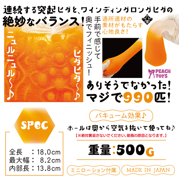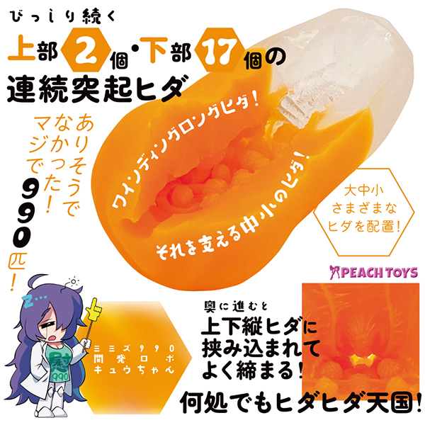 ですが内部構造は只者ではなく、連続する突起ヒダにワインディングロングヒダが迫力満点に襲いかかり、際どい刺激と程よいゾリ感をもたらしながら搾精力を高めてくれます!バランスと長さが異なる990のヒダの数々。
