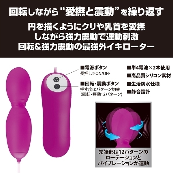 転しながら”愛撫と震動”を繰り返す!!円を描くようにクリや乳首を愛撫する12パターンのローテーション機能が焦らしながら身体を悶えさせる。ローテーションと連動して震動する12パターンのバイブレーションで、直接性感帯を刺激すれば、火照った身体が跳ねあがる!!回転&強力震動の最強外イキローターです♪●12パターン振動●12パターンローテーション●高品質シリコン●生活防水