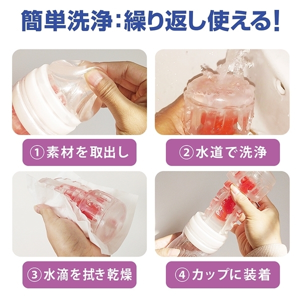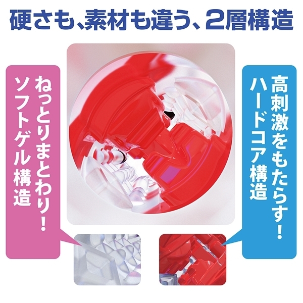 挿入直後からクリップされるように迫りだすコブとブロックのようなヒダの刺激がたまらない!2構造のインナーホールにソフトゲルが包み込むハードな内部構造体が刺激的な非貫通オナホ「CRYSTAL」。
