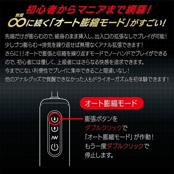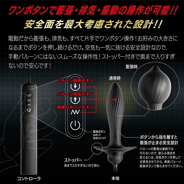 ワンボタンで膨らむ電動アナルバルーンが、前立腺をワイドに圧迫刺激!お好みサイズに膨らませて、眠れる前立腺を一気に覚醒!初心者にも最適細身の本体を挿入後、先端だけを膨らませるので出入口の拡張なしでボリューム感たっぷりの圧迫を楽しめます。