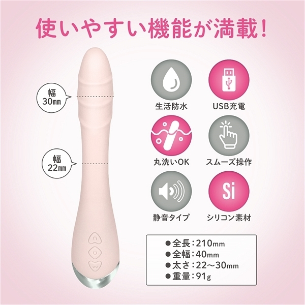あなたにピタッとちょうどいいスティックローター。太さは最大30mmシリコン素材で肌触りも非常によく静音タイプなので周りを気にせず使用頂けます。USB充電の為、電池の用意も必要なく生活防水なので丸洗いして清潔に保って頂けます。操作方法も簡単で10種の振動モードからお好みのパターンを探して見てください。