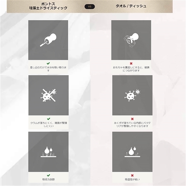 オナホールカップを洗った後そのまま放置すると内部の隙間に水分が残り長時間が経つと、バクテリア、カビ、強い臭いの原因になります。ポントス珪藻土ドライスティックは、おもちゃの水分を奥まで吸収し、おもちゃを何度もひっくり返すことによる損傷を防ぎます。使うことでおもちゃを衛生的で耐久性のある状態に保つことができます。