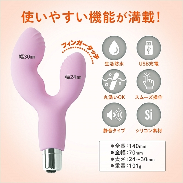 アナタにピタッと絶妙にフィットする肌触り抜群シリコン素材の2股ローター。フィンガータッチは指で挟みこむような形状になっており振動部とシリコン部は取り外しが可能なため丸洗いも出来、清潔にご使用いただけます。10モードの振動パターンの中からアナタにピタッとを探してナカイキ覚醒を体験。