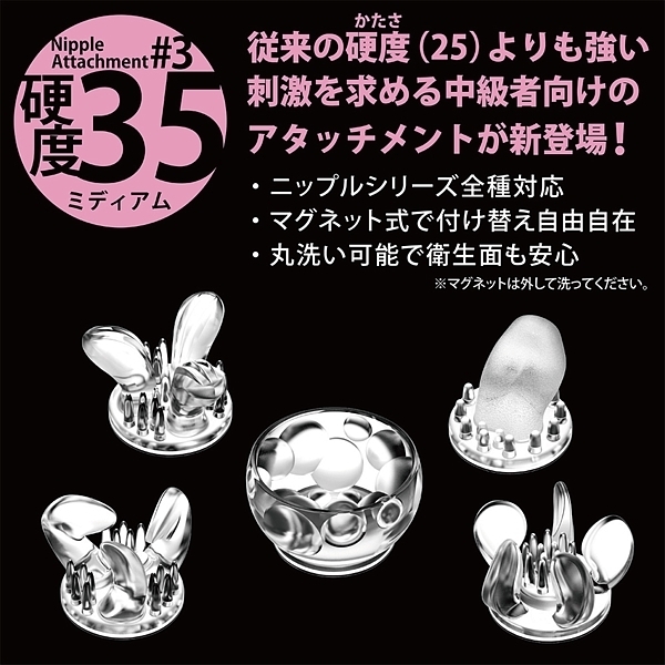 個性あふれる5種のアタッチメントを、両乳首に使えるよう、すべて2個ずつご用意。
