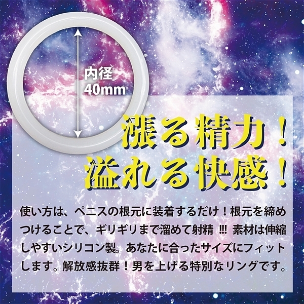 根元に装着!たったこれだけで射精感が倍増!?男根パワーがアップするシリコンリングです。ペニスの根元を締め付けることで、ギリギリまで溜めて一気に発射!今まで以上の射精感と溢れる快感があなたを襲います。変幻自在の柔らかシリコン素材だから、フィット感も◎。おすすめのローションも付属しています。漲る精力で男を上げる特別なリングです。
