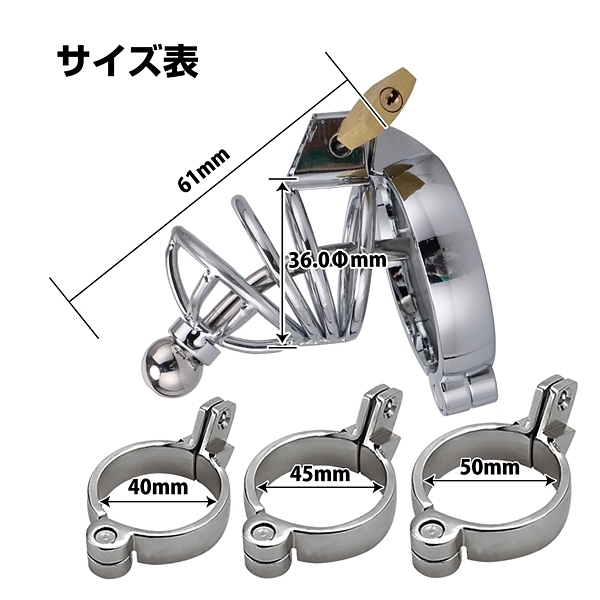 - パッケージ:28.0×18.5cm 本体:ペニスゲージ6.1×3.6cm・固定リング小(内径4.0cm)・固定リング中(内径4.5cm)・固定リング大(内径5.0cm) セット内容:ペニスゲージ、固定リング3サイズセット、尿管、南京錠、収納袋