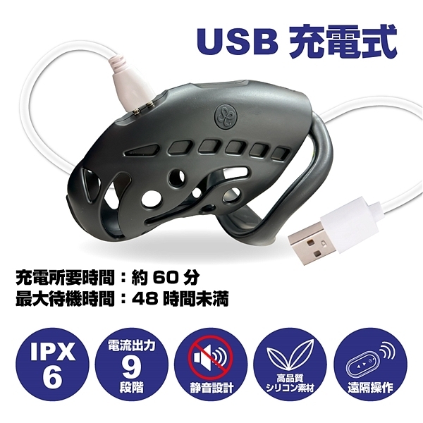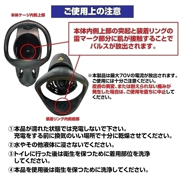 射精管理電流調教!悶絶!電撃低周波パルスコックケージの新商品が登場!熱や衝撃に強いABS樹脂で造形された、見た目もスタイリッシュな見た目。陰茎上部とリングの二か所から放出されるパルスは、9段階強さの調整が可能。初心者でも安心な弱パルスから、痛みを伴う強パルスまで、レベルに合わせて使用可能。自身のサイズに合わせやすい、3サイズのリング付き。