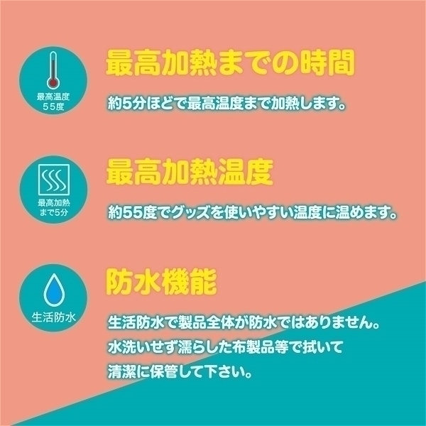 いつものグッズに体温のような温もりを与えて本物に近い体験を!スタンドタイプのウォーマなので温める時だけでは無く、使用後の乾燥にも使用可能です。USBを挿すだけの操作が要らないラクラク仕様。全長125mm、ロッドの長さ110mmと汎用性のあるサイズとなっております。