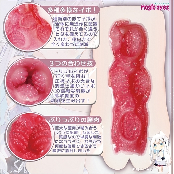 モチモチふわふわで雪のように白い肌。くぱぁと入り口を開くと妖艶で巨大な膣肉が迎えてくれます。入口部、中段部、最深部にそれぞれ方向とテクスチャーの違うぼてイボを各3つ配置したことにより様々な使用感を味わえます。310gと実用性にも優れたサイズ。パッケージイラストは人気イラストレーター「ユイザキカズヤ」先生の描き下ろしです。