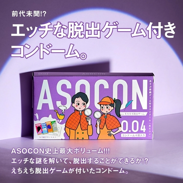 新たな刺激を楽しめる謎解き体験が登場♪あそぶ前戯ゲーム付きコンドーム「ASOCON」えちえち脱出ゲームは、2人で協力して楽しめる謎解きゲーム付きセットです!舞台はちょっと特別なシチュエーション♪付属の冊子には、全5種類のミッションが収録されています!謎を解きながら物語を進めていくことで、自然とコミュニケーションが深まります♪頭を使いながらワクワク感を共有できるのがこのアイテムの魅力です!「ASOCON」シリーズ史上最大ボリュームの内容で、何度も楽しめる工夫が満載♪コンドームは0.04mmの薄さで、使いやすさにも配慮!素材は天然ゴムラテックス製、ゼリー加工でスムーズな使用感を実現しています♪いつもと違う体験を求めているカップルにぴったりのアイテムです!