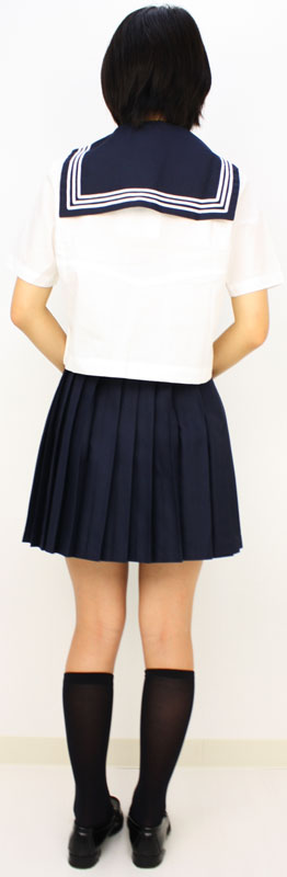 セーラー服の胸当てがワンポイントで、シックなカラーのスカーフが落ち着いた雰囲気の半袖セーラー服です。