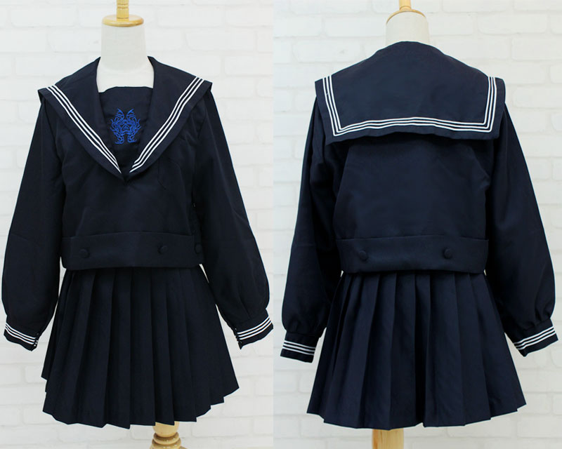 清潔感ある白い3本ラインが入った濃紺の長袖セーラー服は、サイドファスナー仕様。