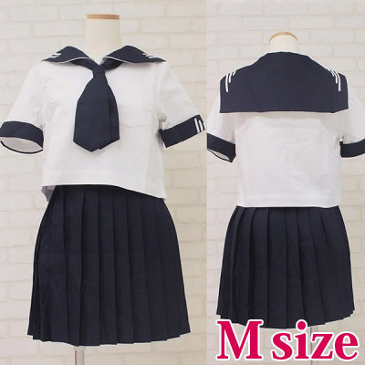 半袖セーラーブラウス、プリーツスカート、紺色スカーフのセットです!セーラー襟と袖に入った、個性的な白ラインがお洒落なお嬢様風制服コスプレです。