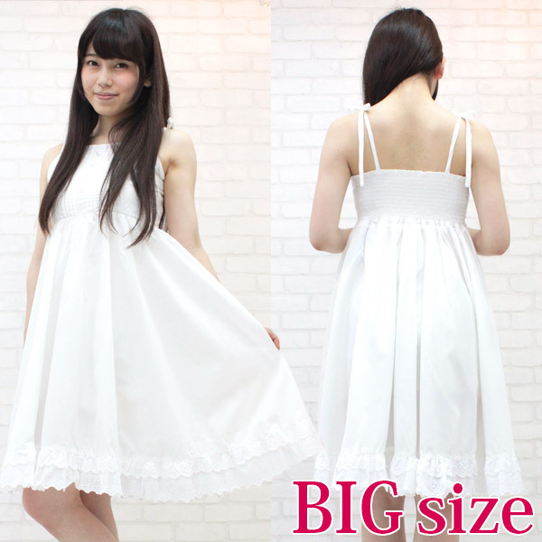 夏のよそいき、お出かけスタイル!BIGサイズでも超可愛い、ホワイトワンピース。肩紐の可憐なリボン結びや、裾のレースが愛らしい!日焼けした肌にも見事に映えるワンピースは、コーディネイト自在のサマーコスチュームです。※水洗い不可、塩素系漂白剤による漂白不可、アイロンは中温で当て布使用、ドライクリーニング可。※こちらの商品は在庫の状況によりお届けまでに4日〜7日程度かかる場合がございます。