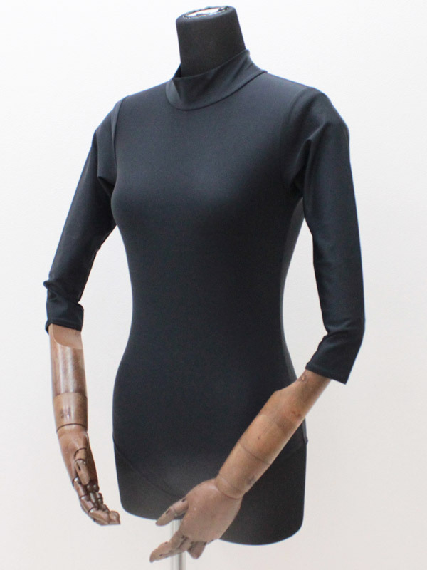 柔らかで伸縮性のある生地を使用した、ブラックカラーのシンプルな七部袖丈ハイネックレオタード(単品)。