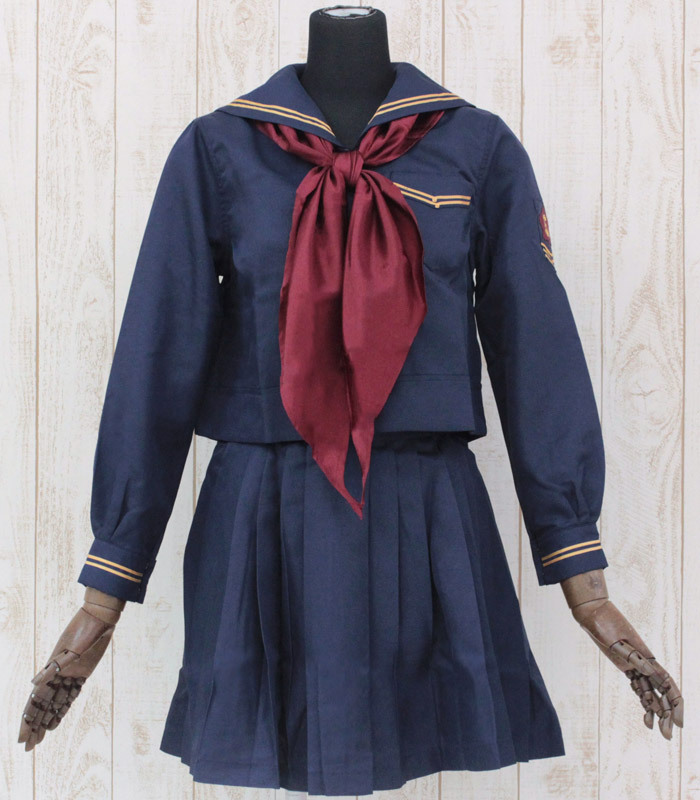 濃紺にエンジ色の長いスカーフがポイント!茶系のダブルラインが珍しい長袖セーラートップスと、無地のプリーツスカートがエレガントな制服コスチュームです。