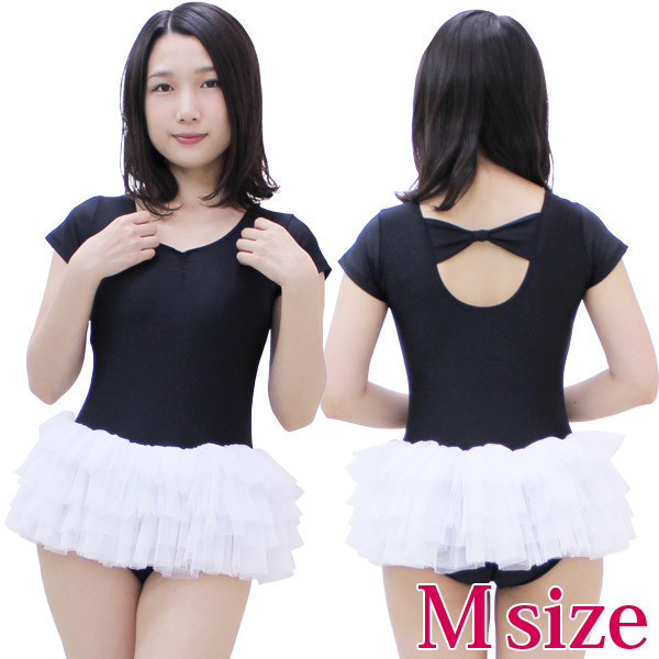 トップページ > コスプレ衣装 > バドガール・レースクイーン > チュールスカート付き半袖レオタード(後ろリボン) 黒×白 M