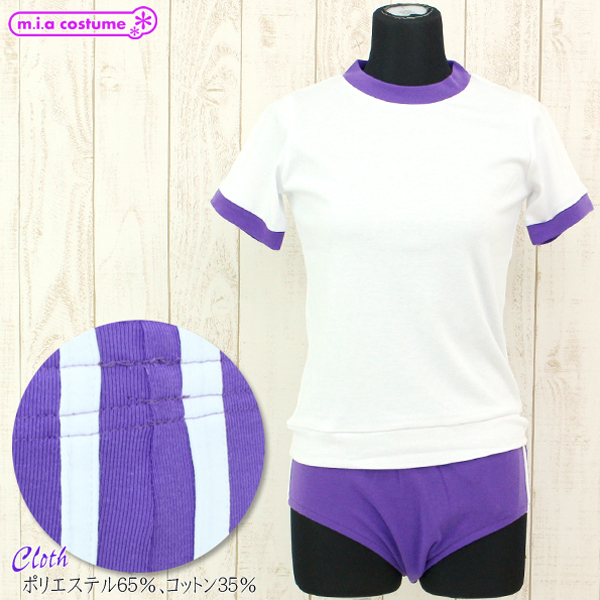 濃いめの紫カラーのブルマに本格的な二本ラインを施した可愛い体操着コスプレ。