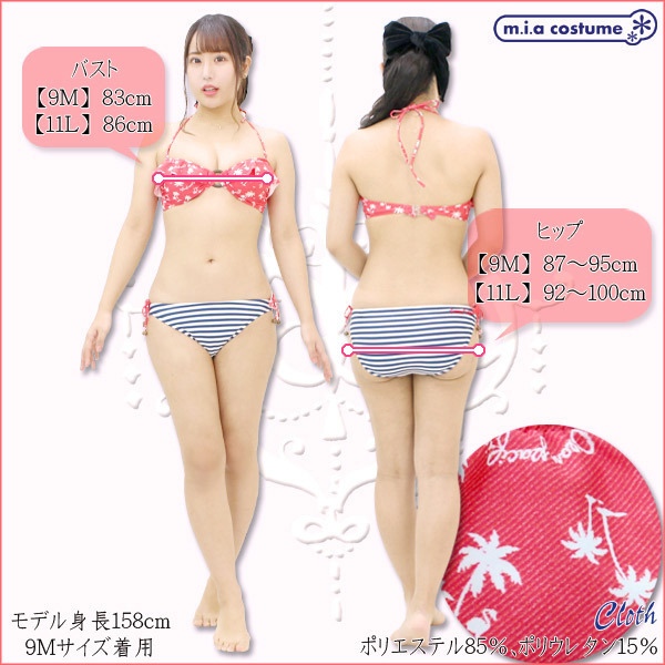 スポーティだけど可愛い!日本製のマリン風ビキニ水着2点セット(赤)。ヤシの木柄をプリントした南国感のあるブラに、青×白の横ボーダー柄ショーツを組み合わせた可愛い一着!ブラはパッド付きで着脱可能※手洗い可(水温30度)、塩素系漂白剤、アイロン、ドライクリーニング不可、色落ちの可能性があります。※こちらの商品は在庫の状況によりお届けまでに4日〜7日程度かかる場合がございます。