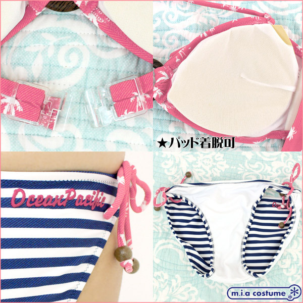 ホルターネック仕様のブラにはヤシの木柄を取り入れ、ショーツには爽やかな青白ボーダーをプリントすることで南国風にまとめた一着♪ブラは着脱可能なパッド付き、日本製