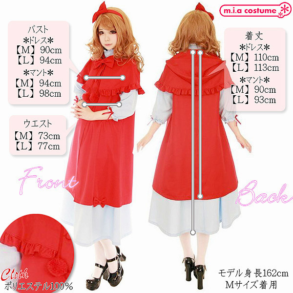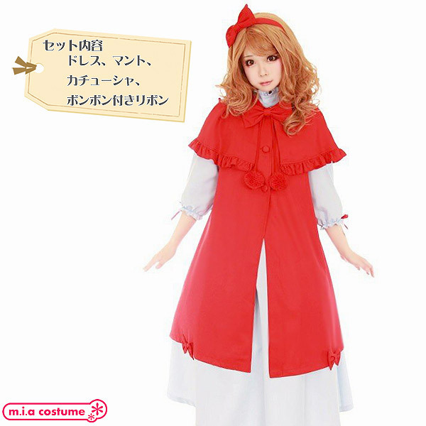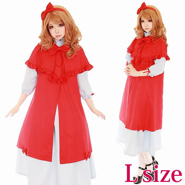 フリルやリボンをあしらった真っ赤なマントに、ハイネックの白ロングワンピを合わせることで上品かつ可愛くデザイン!袖口に小さなリボンを飾っているところにも、こだわりを感じる一着です。