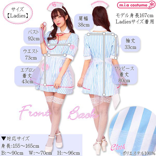 仮装コスプレのなかでもファッションにこだわりたいならこちら♪ストライプ生地にオーガンジーの透けた紋章とエプロンが可愛いブルーソーダナース(衣装)です。