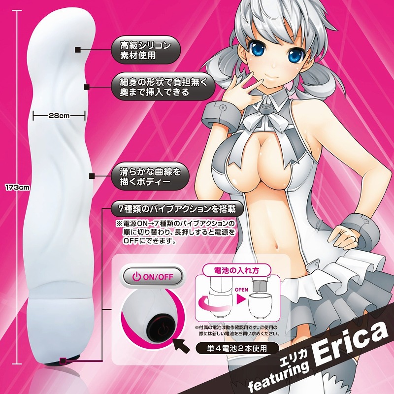清潔感のあるホワイトカラーの本体は、パッケージモデル「Erica」の細身ボディを再現!滑らかな曲線と細身の形状で、カラダに負担を与えることなく奥まで挿入が可能!使い方は簡単、、底に付いたスイッチを押す度に振動が切り替わり、長押しで電源OFF!計7種類の振動が刺激と快感を与えます。