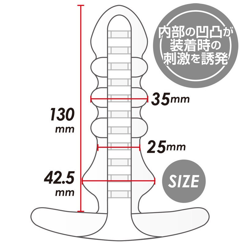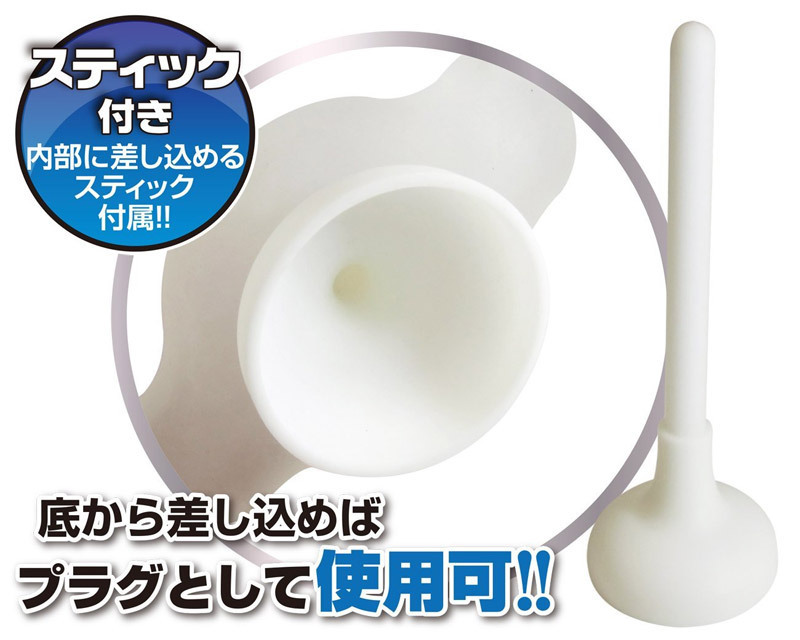 ●お洒落なクリアホワイトシリコン●まずはアナルにプラグをIN●底部ストッパーを摘んで広げる→中心の穴にローションを充填→ペニスを挿入●プラグはそのまま固定・腰を動かしてピストン開始●内部は凸凹が際立つ刺激的な連続リング●中心に差し込むと芯ありに変身するスティックつき。