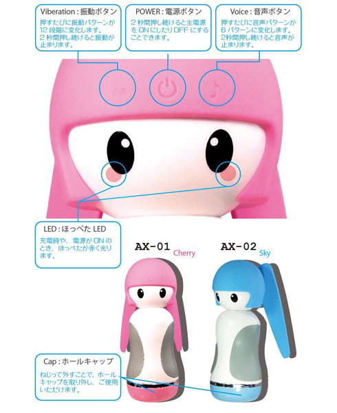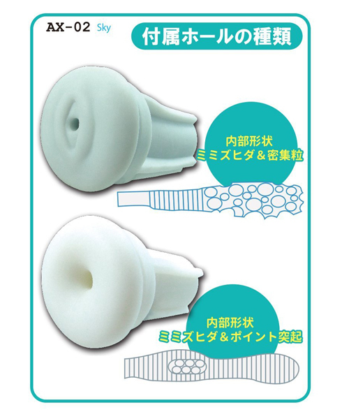 ●クリクリお目目が可愛いi:MEのスカイver●前髪部分に3つのボタンスイッチ●真ん中ボタン…電源ON/OFF●右(♪)…音声ボタン●左…振動ボタン●本体底部ホールキャップ●USB充電式●背面…イヤホン端子・充電端子・吸盤取り付け口あり●充電&電源ONの際は赤色のLEDランプ点灯●内部構造が異なるオナホ2点付き●青…ミミズヒダ&密着ツブ構造●白…ミミズヒダ&イボ突起構造●強力吸盤付きなのでお好きな場所に固定可●ホール底部にローターを差し込んでから使用してください。
