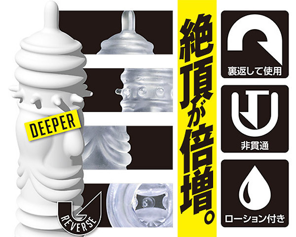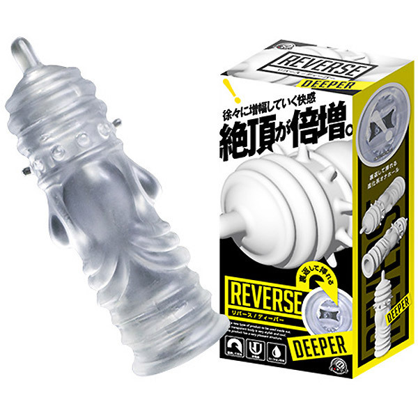 裏返して挿入するリバースシリーズ!多彩なギミックで刺激する進化系オナホール。●ペニスサック風クリアボディ●イボヒダ系ギミックの「DEEPER」●挿入時は裏返して突起を内側に●奥突きの度に先端突起が刺激●カリを360度刺激するイボ突起付き●裏返しやすいので洗浄も楽々。リバース式だからこそ実現した複雑構造!まるでタコのような巨大イボ&ヒダなど、バラエティに富んだギミックがてんこ盛りのオナホールです。