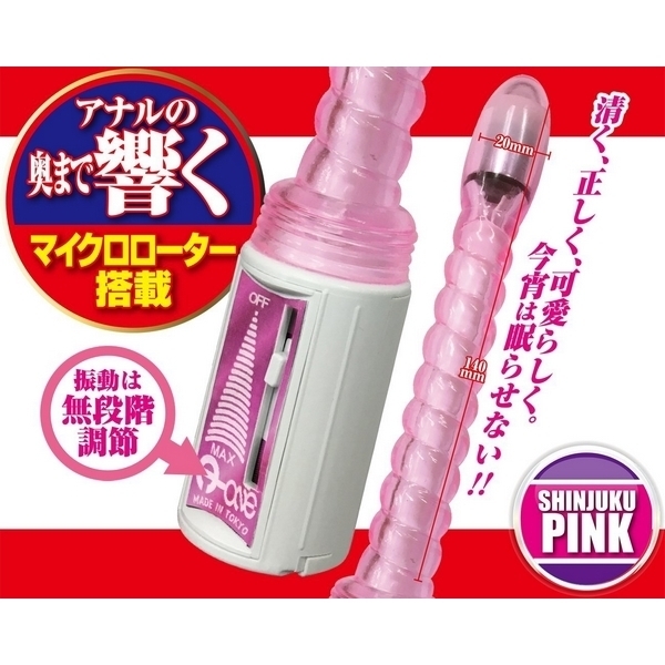 ●新宿ピンクカラータイプ●フレキシブルな柔軟ボディ●ポコポコ刺激のスクリュー型●挿入部約14cm、最大径約2cm●先端にマイクロローター搭載●奥まで届くパワフルな振動●振動調整は無段階スライド式●安心安全な日本製グッズ。
