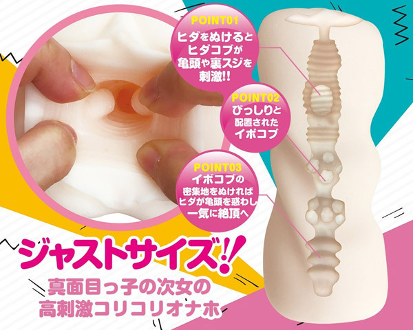 スケベ四姉妹と中出しSEX!真面目っ子の次女モエのコリコリ高刺激オナホール「おなシスタ02 萌(MOE)」。『おなガール』の血を受け継いだ新シリーズ『おなシスタ』が登場!ジャストサイズの内部は挿入直後のヒダコブが亀頭や裏スジを刺激!中間部にびっしりと配置されたイボコブの密集地を抜ければ、大きめヒダが亀頭を惑わし一気に絶頂へと誘います。