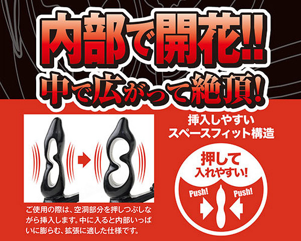 中央の空洞部分を押しつぶして細身にすることで挿入しやすく、挿入後は内部いっぱいに膨らむ『スペースフィット』構造を採用。