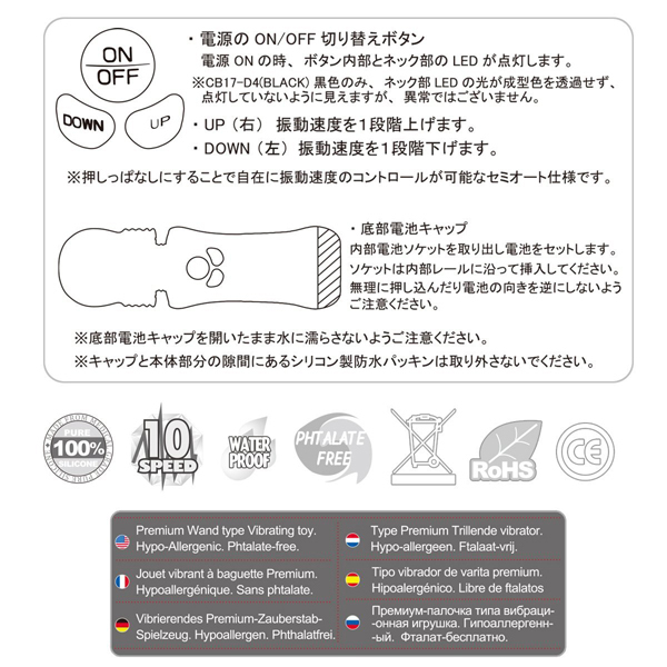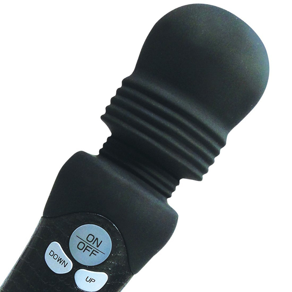 シックで重厚感のある見た目同様、そのパワーは電池式とは思えないほどのパワフルさで、3つのボタンだけで10段階もの振動速度を変更できるというのだから驚き!肌にじかに触れるヘッド部分は肌に優しいピュアシリコンを採用しており、平たい形状なので広範囲にわたっての刺激が可能。
