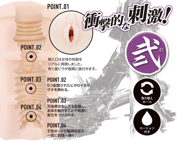 好きなホールでカスタマイズ。ピストンキング電王の専用ホールが3種同時に参上!!衝撃的な刺激を楽しめる弐は、突起が当たるインパクトTYPE!!※こちらの商品はオナホ単体でも楽しめますが電王(e25149)に装着することでポテンシャルを発揮します。※ピストンキング電王本体は別売りです・ローション付属