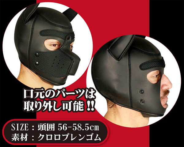 アニマルプレイに最適!!ドッグ型アニマルマスク。長時間の使用でも耐えられる柔軟素材のゴム製マスク。口元のパーツは取り外し可能!!男女兼用