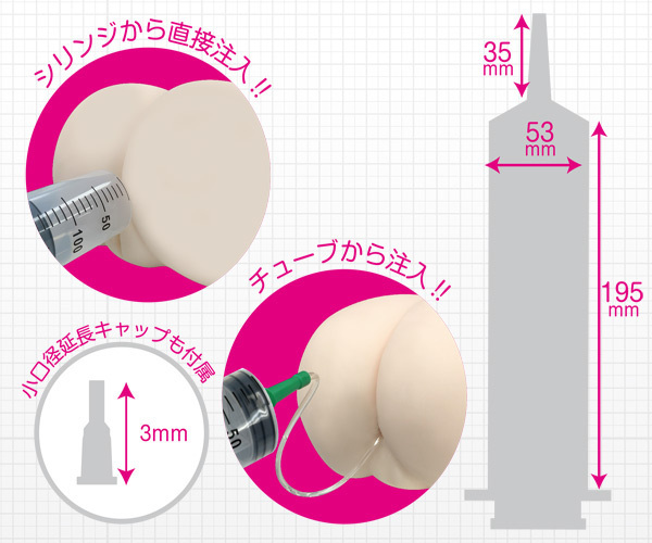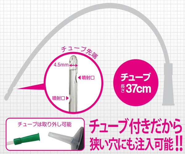 自宅で手軽にお医者さんごっこ!最先端ジョークグッズ「MEDY」シリーズに、取外せる37cmチューブが付いたプラスチック製シリンジ。全長19.5cm、筒先の長さ3.5cm、容量は最大350mlまで対応!2箇所の噴射口が付いたチューブなら狭い穴でも簡単に奥まで注入できます。使用後は洗って綺麗に保管すればいつでも清潔にプレイ可能!気兼ねなく快適な洗浄ライフを♪