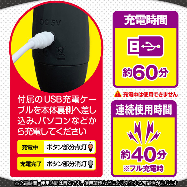 重量103gの軽さと、欲しい場所に当てやすいネックの柔軟性、初心者でも簡単に使えるシンプル操作が魅力!振動パターンは10種類と豊富に搭載し、ヘッド部3.7cmと程よいサイズ感で挿入もOK♪おうち時間のおともに◎充電1時間で約40分稼働、充電ケーブル付