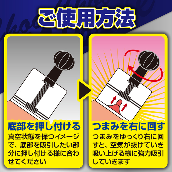 真空状態を保つイメージで底部を吸引したい部分に押し当て、つまみをゆっくり右に回すことで強力吸引!皮膚にしっかりと密着するように、ローションなどを使うとさらに快感度もアップ!乳首だけでなく、アイデア次第でいろんな吸引調教を楽しんで♪サイズ違い、AとBの2タイプ同時発売!