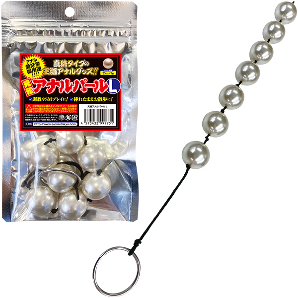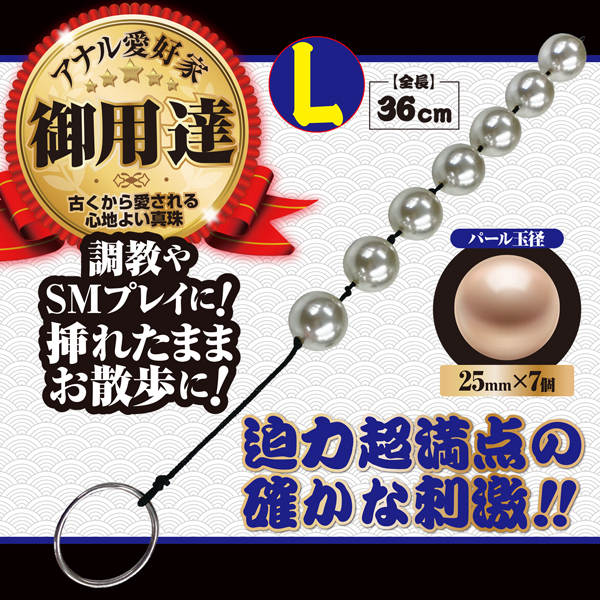 こちらは全長36cmでパール直径2.5cm(7連)と迫力満点のLサイズ!真珠のように輝くパール玉をヌプヌプと入れて楽しんだり、直腸内に入れた状態を楽しむなど多彩な快感が自慢。
