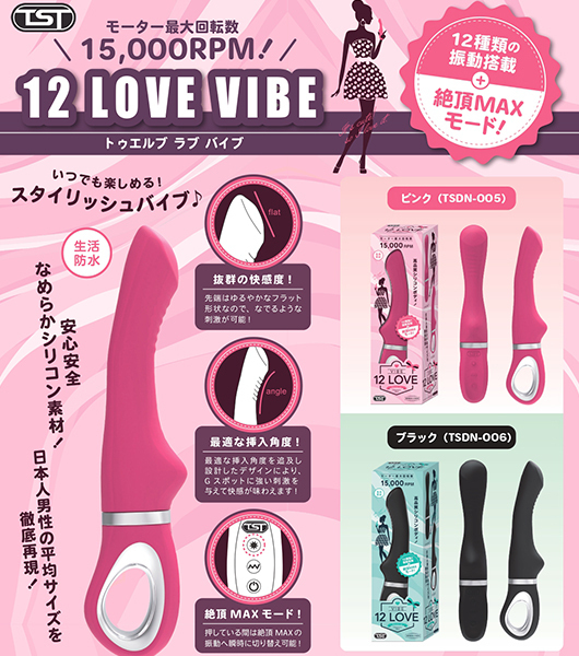 12LOVEシリーズからスタイリッシュバイブが新登場!静音タイプながら弱振動から強振動の12パターンを搭載し、ボタン1つで簡単ラクラク操作♪ボタン上部を押している間はモーター最大回転数15000RPMの超強力振動により一気に絶頂MAXへと導きます。