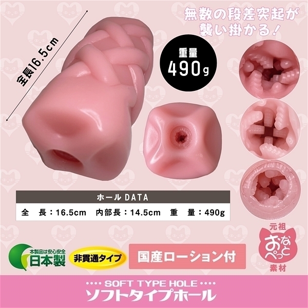 無数の段差突起が襲い掛かる!元祖おなぺっと素材を採用!ふわふわ、モチモチ、絡みつきバツグン!柔かい素材で心地いい時間が長く楽しめる!入り口はキュッと締まり、先を進むと段差のある突起が全体をポコポコ乱打!最深部までビッシリと突起が設置させており、ストローク時には入る時も戻る時も刺激がたまらない♪