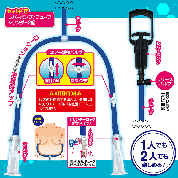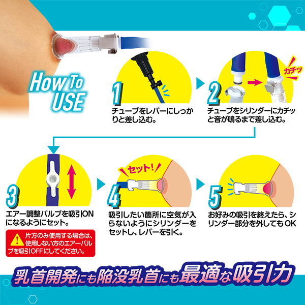 超強力吸引!1人でも2人でも楽しめる!!同時に乳首をW責め!!!シリンダーの径が小さいからピンポイントに超強力吸引!!!1個だけの吸引も可能。両乳首・片乳首、クリだけなど…ローションを使用して密着感UP。アイデア次第で感じる乳首開発を♪エアー調整バルブで微調整が可能なので、自分に合った吸引具合で楽しもう♪