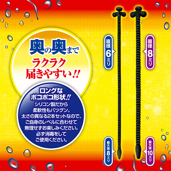 U−プラグシリーズに、ロングな奴らが登場。とにかく長い!ロン〜グなシリコンチューブ。長いから奥の奥まで届きやすい!!開発具合を実感しやすい太さの異なる2本セット。工夫次第で楽しめるキャップも付属。シリコン製だから柔軟性もバツグン。中が空洞なので、汚れてもサッと洗い流せて、使い方もいろいろ!