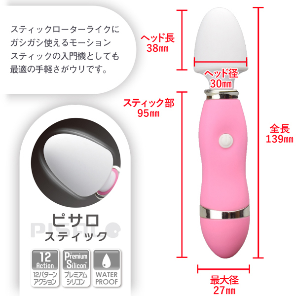 携帯サイズなのに12種類のアクションとパワフル振動が味わえるお手軽ミニ電マ。柔らかく肌に優しいシリコン素材を使用し、使い心地にこだわった逸品!持ち手はマットラバー素材で握りやすく振動による痺れを軽減、生活防水製なのでメンテナンスも楽々♪外出先でも楽しみたい、モーションスティックの入門に最適なコンパクト電マです。
