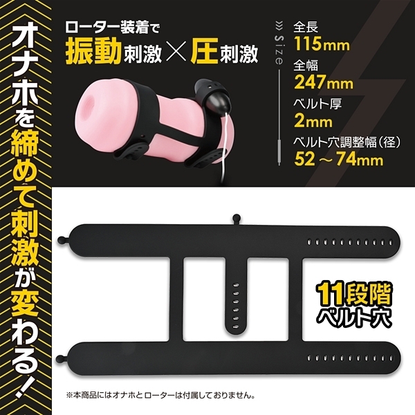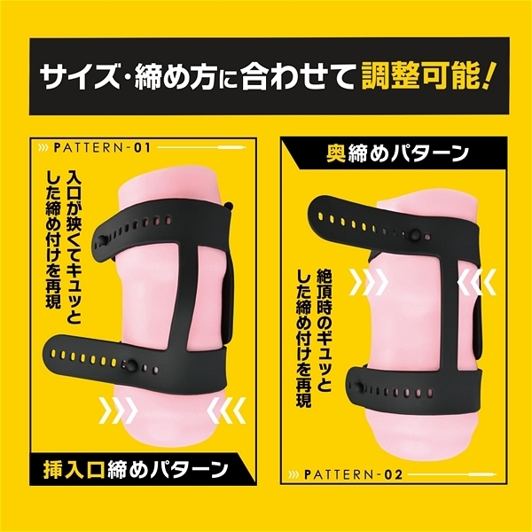 オナホに装着して2箇所の締まり具合を自在に調節圧迫出来る伸縮性シリコンベルト。11個のベルト穴で様々なサイズのオナホ・締め方に対応出来ます。挿入口側のみキツくしたり、奥側を締め付けたり、好みに合わせて楽しめる。さらにローターを固定出来るローターベルトも搭載しているので振動刺激もプラス出来る。締まりが変わればオナホが変わる!オナホール用オプションアイテム。