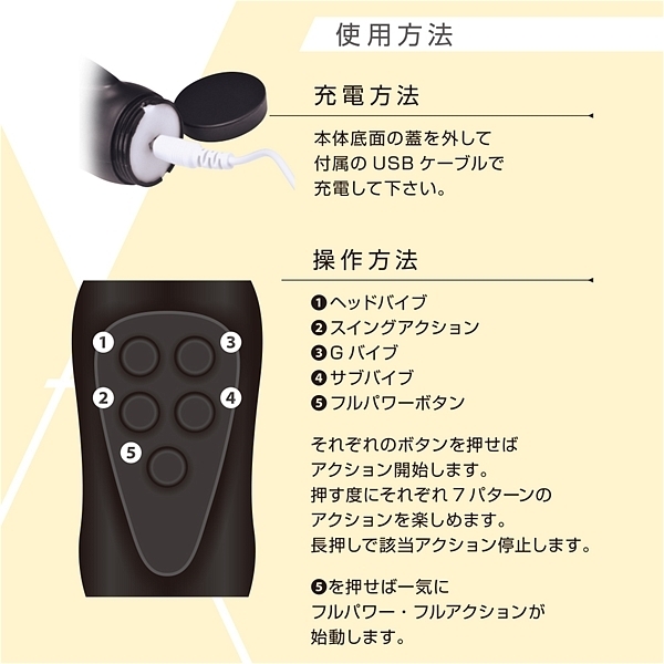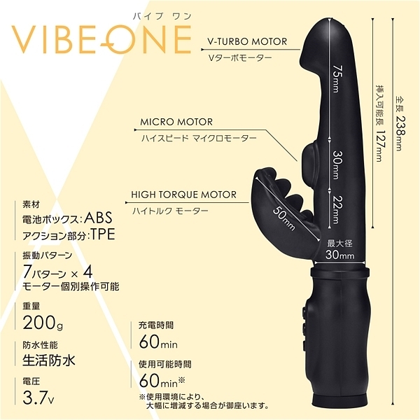 ヘッドにターボモーター・G位置にハイスピードマイクロモーター、さらにサブバイブにもハイトルクモーターを搭載した3バイブ+スイングアクションが楽しめるプレジャーグッズ。