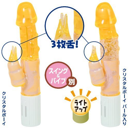 本体内部に贅沢なパールを内蔵し、使用時にはその部分が怪しくライトアップ!カリの直径約3.8cmと巨根マニアの方も納得!子機も3枚舌仕様と抜かりなし!さらにスイングとバイブの個別動作が可能…と、見た目と性能どちらも兼ね備えた次世代バイブ!