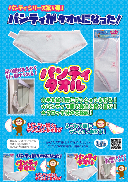 手を洗うのが楽しみになる!リグレジャパンのパンティシリーズに第4弾が登場。可愛らしいデザインの吊り紐付きタオル!自宅の洗面所に、カバンの中に、いつでもどこでもパンティーで顔や手など身体を拭ける♪使いこむほど味が出るクロッチ付のパンツタオルです。「聖の聖臭」シリーズと組み合わせてみても◎