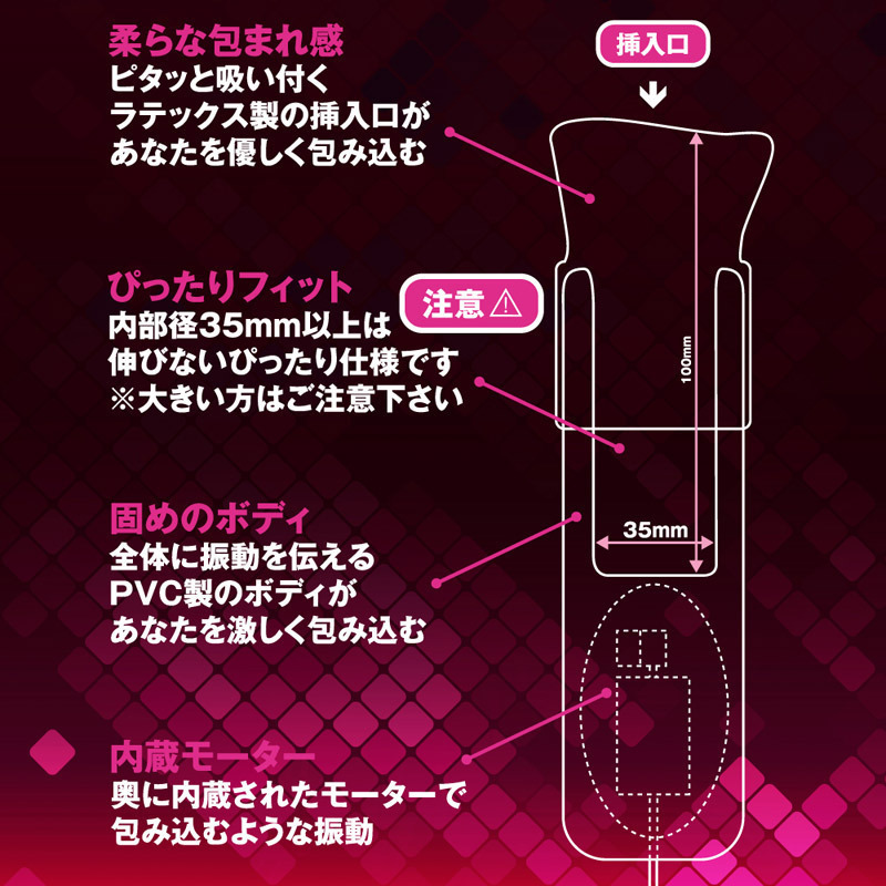ピタッと吸いつくように包み込むラテックス独特の挿入感を生む至高の電動オナホール!設計上、最奥部の内径は35mmまでとなりますのでご注意ください。